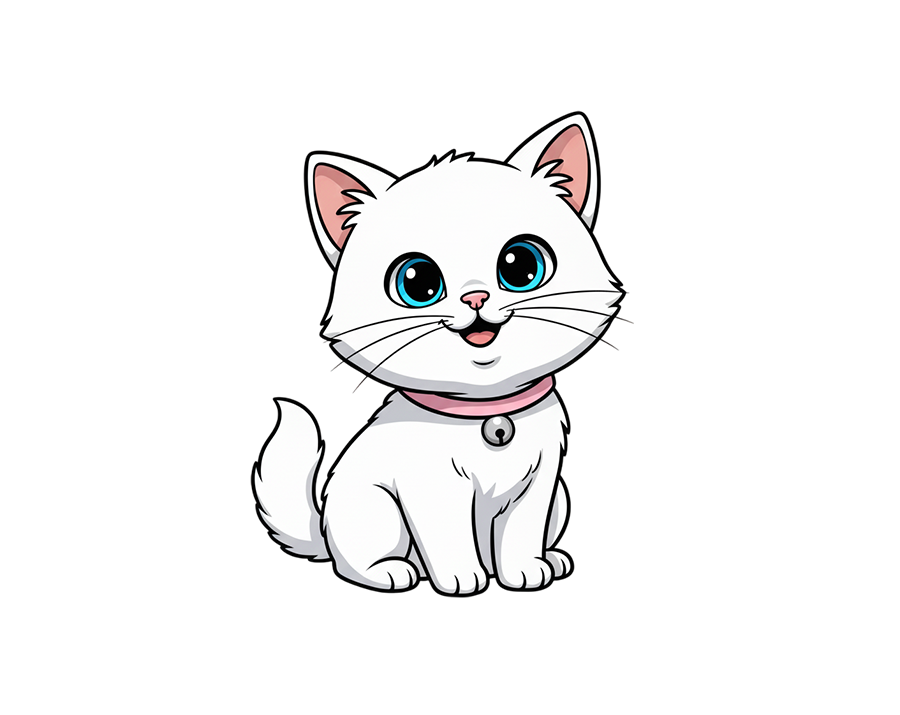 An adorable, sitting, cartoon-style white kitten illustration with bright blue eyes, wearing a pink collar with a bell.