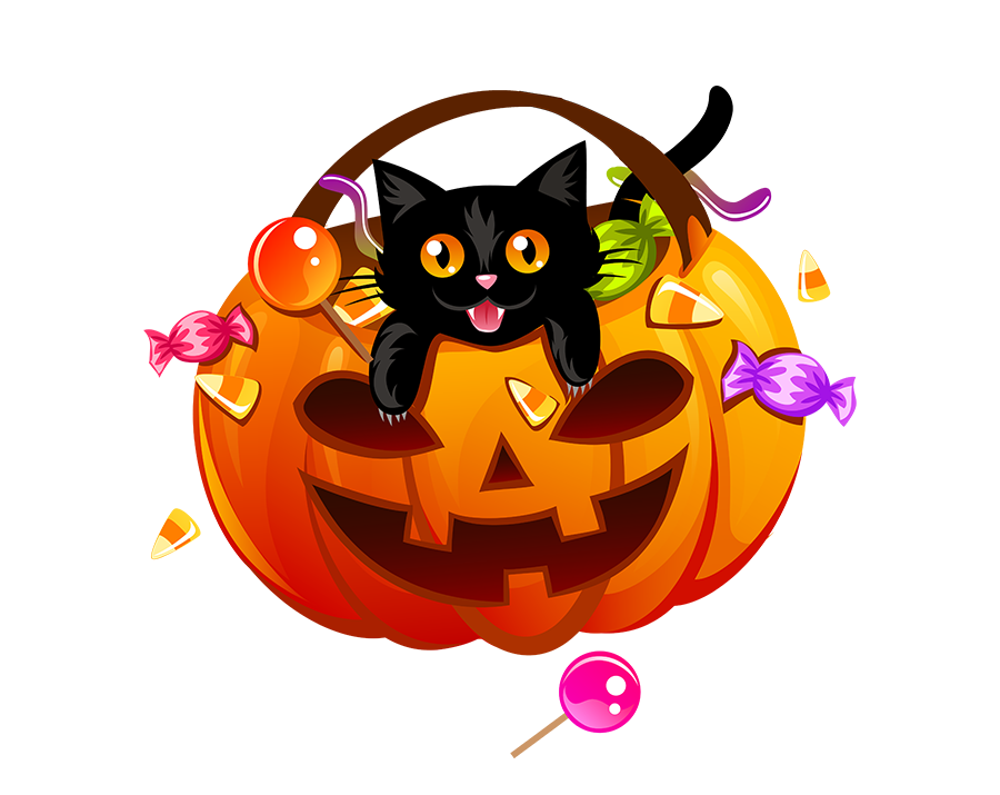 Transparent Halloween PNG image of a smiling jack-o'-lantern decorated with a peeking black cat and surrounding candies