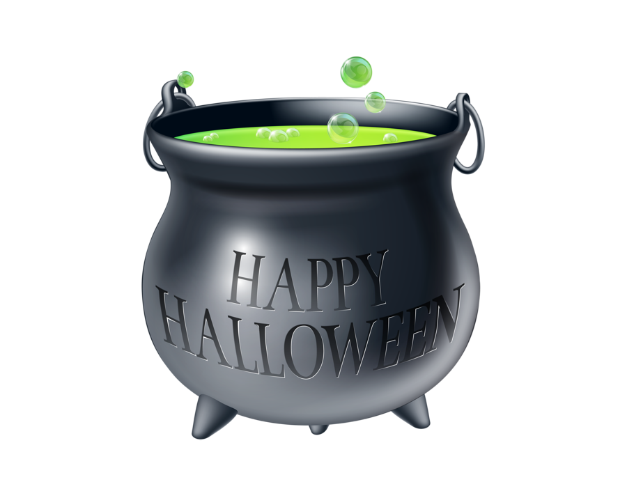Black witch's cauldron illustration filled with bubbling, bright green potion, featuring the embossed text "HAPPY HALLOWEEN."