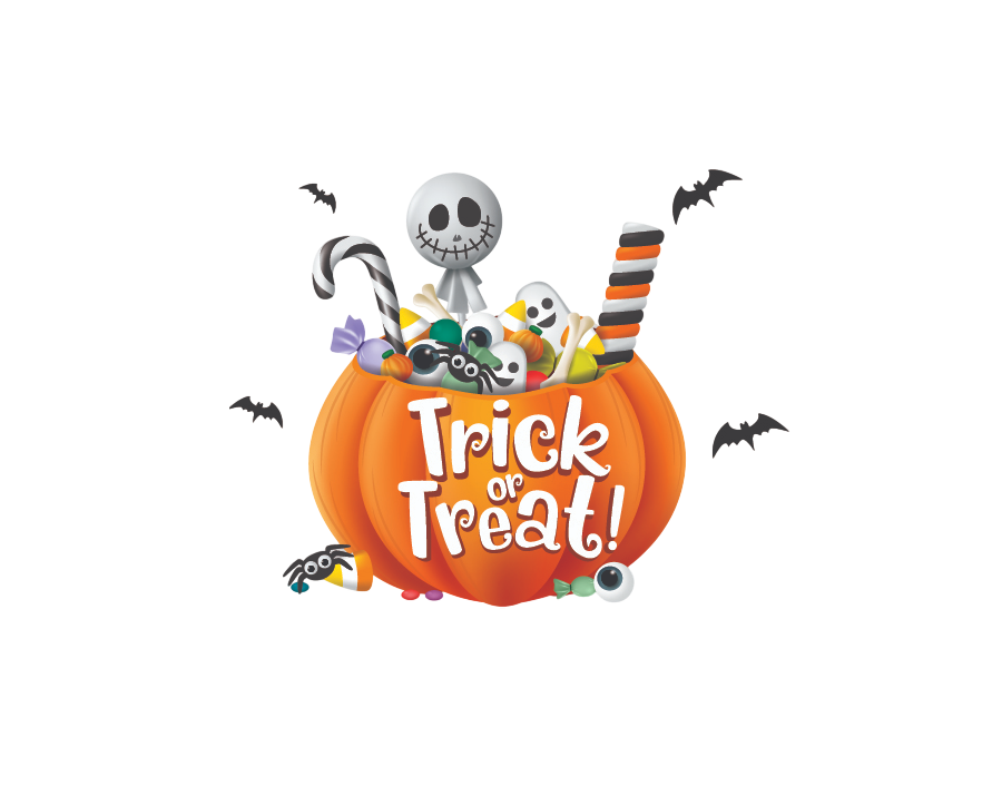Transparent Halloween PNG image of a pumpkin candy bucket with "Trick or Treat!" lettering, filled with a skeleton, ghosts, and colorful candies.
