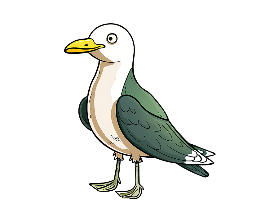 A flat, cartoon-style illustration of a standing white seagull with dark green wings and a yellow beak.