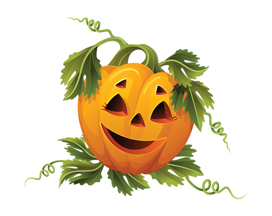 A Halloween illustration of an orange Jack-o'-lantern (carved pumpkin) with a carved, large grinning mouth and triangular eyes, surrounded by green vines and leaves, set against a transparent background.