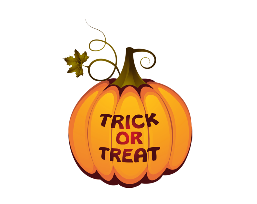 An orange Halloween pumpkin illustration with a stem and vine, featuring the words "TRICK OR TREAT" written across the center in bold, brown letters.