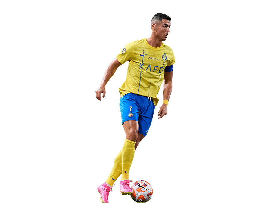 Cristiano Ronaldo running with a football at his feet, wearing the yellow and blue Al Nassr home kit, with a transparent background.