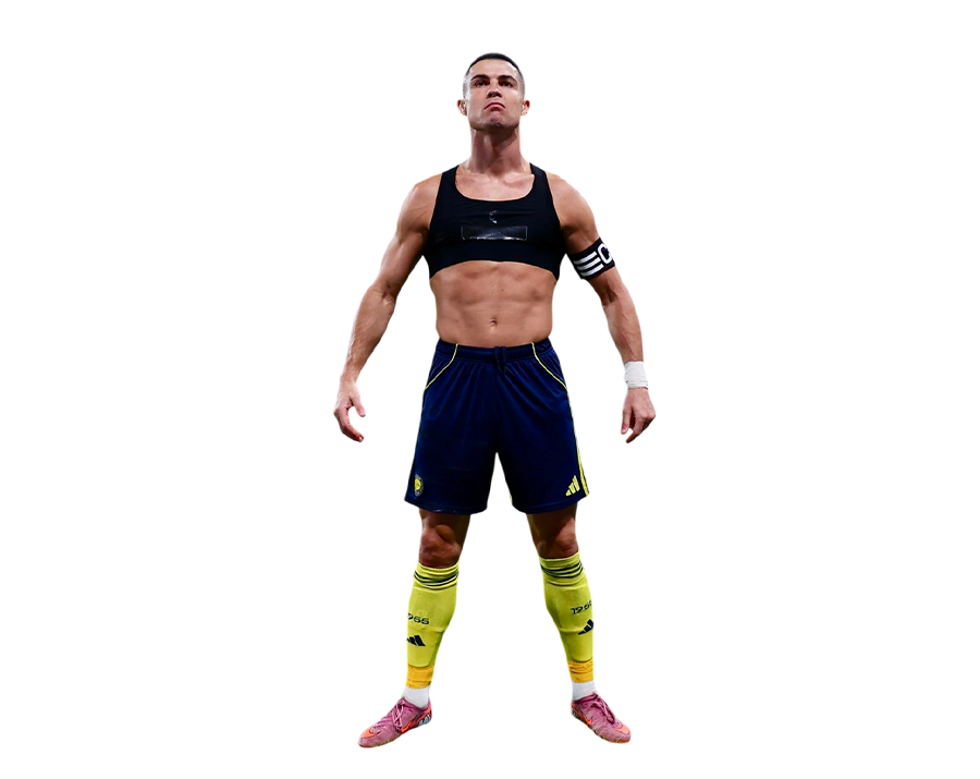 A full-body, transparent PNG render of Cristiano Ronaldo in his training attire (bra-like vest for performance tracking), highlighting his fitness.