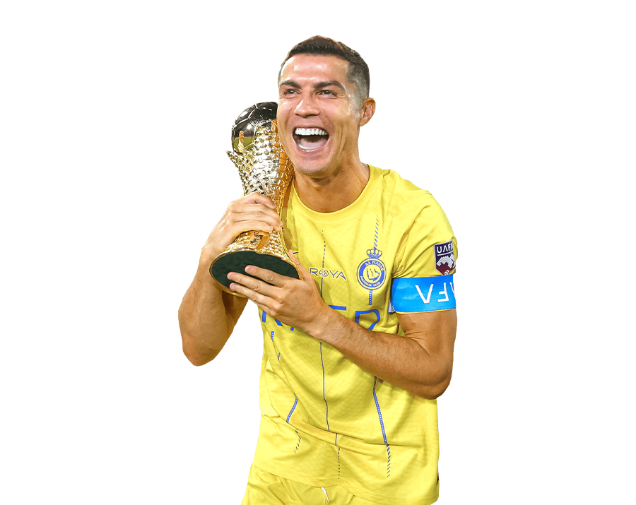 Cristiano Ronaldo holding a golden trophy and celebrating enthusiastically in the yellow Al Nassr kit, with a transparent background.