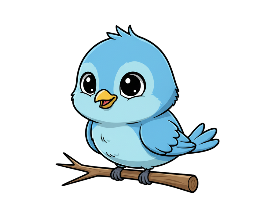 An adorable, cartoon-style blue bird illustration sitting on a branch, with large black eyes and a small yellow beak.