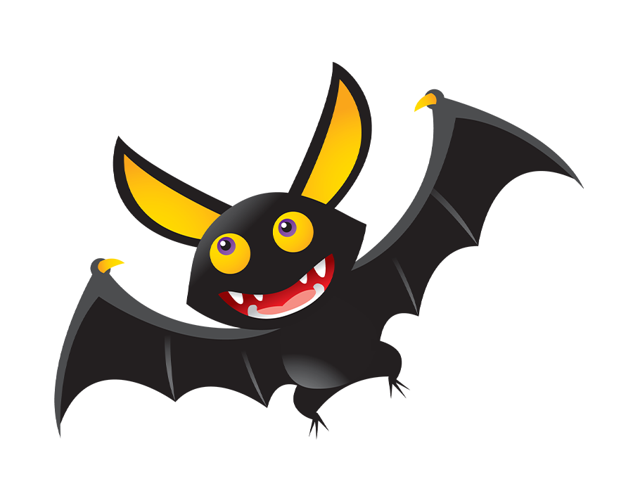Transparent Halloween PNG image of a cute, cartoon-style flying black bat illustration with yellow ears and purple eyes.