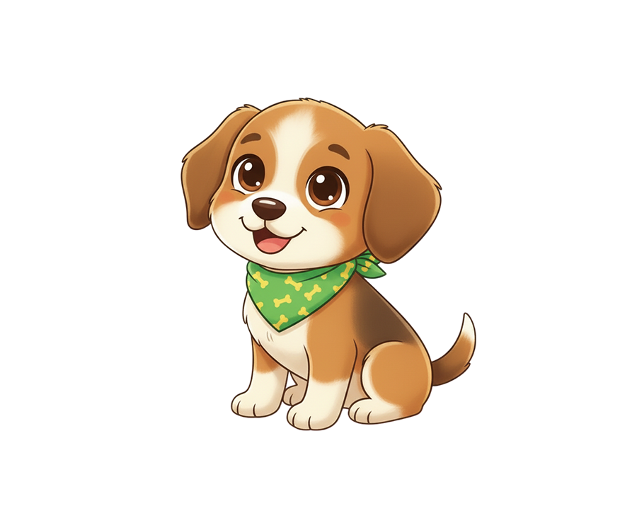 An adorable, sitting, cartoon-style puppy illustration with brown and white fur, resembling a Beagle, wearing a green bandana with a bone pattern.