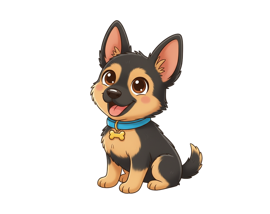 An adorable, sitting, cartoon-style German Shepherd or similar breed puppy illustration with black and tan fur, wearing a blue collar with a bone-shaped tag.