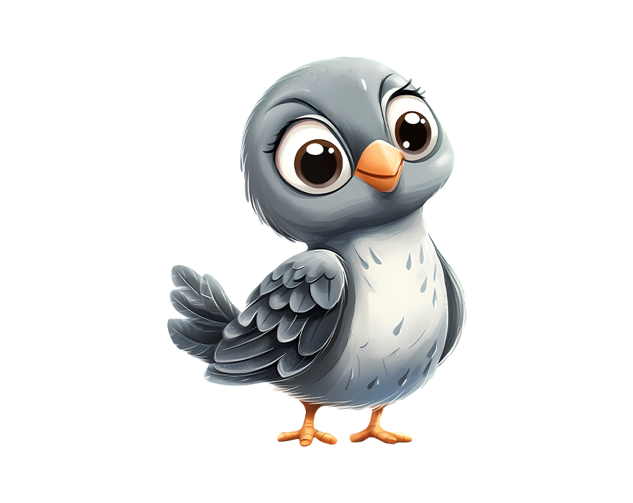 An adorable, cartoon-style grey and white pigeon illustration with large brown eyes and an orange beak.