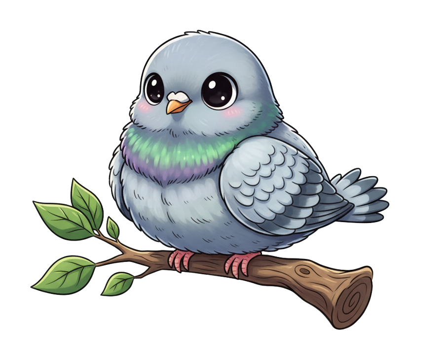 An adorable, cartoon-style pigeon illustration sitting on a branch, with large black eyes and a small pink beak. It has green and purple coloration on its neck.