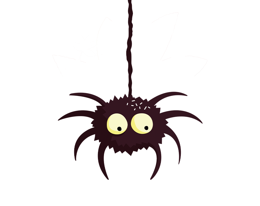 A cartoon illustration of a dark, fuzzy spider with large, startled yellow eyes and six legs, dangling from a thick strand of web against a transparent background.