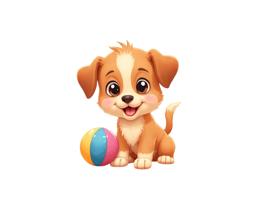 A cute, cartoonish puppy illustration with brown and white fur, large eyes, sitting next to a striped beach ball (pink, yellow, blue).