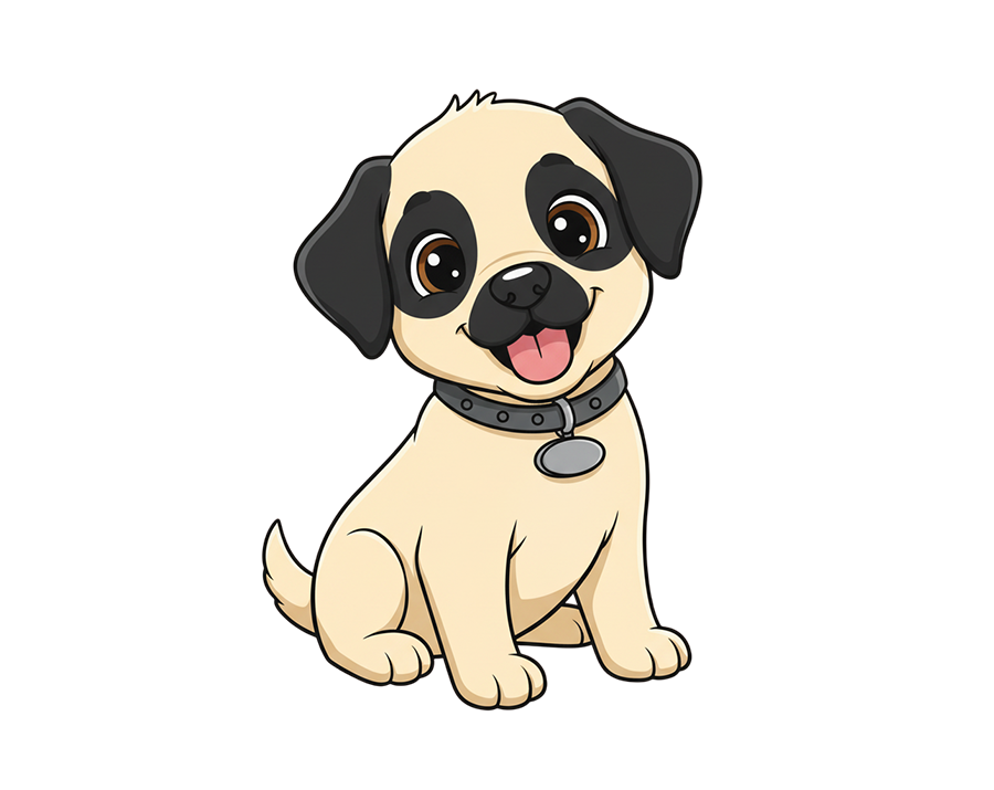 An adorable, sitting, cartoon-style fawn-colored Pug or Puggle puppy illustration with black ears and eye patches, wearing a grey collar.