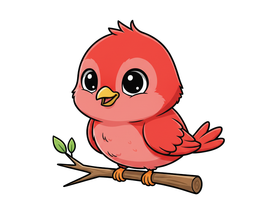 An adorable, cartoon-style red/pink bird illustration sitting on a branch, with large black eyes and a yellow beak.