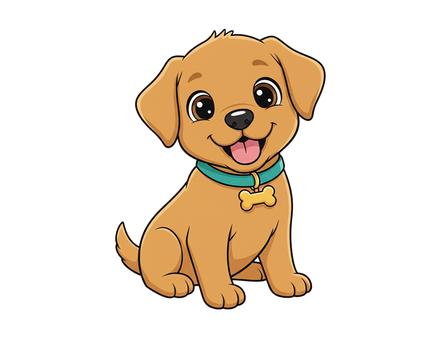 An adorable, sitting, cartoon-style Labrador or Golden Retriever puppy illustration with tan/brown fur, wearing a teal-blue collar with a bone-shaped tag.