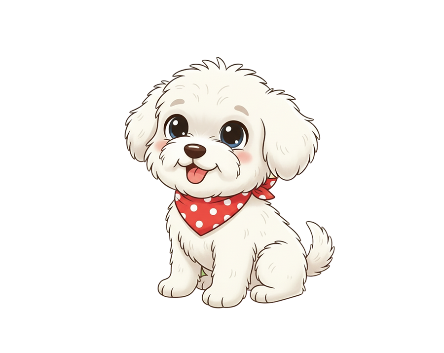An illustration of a cute, white-furred Maltese or Bichon Frise puppy with large eyes, sitting and wearing a red, polka-dot bandana.