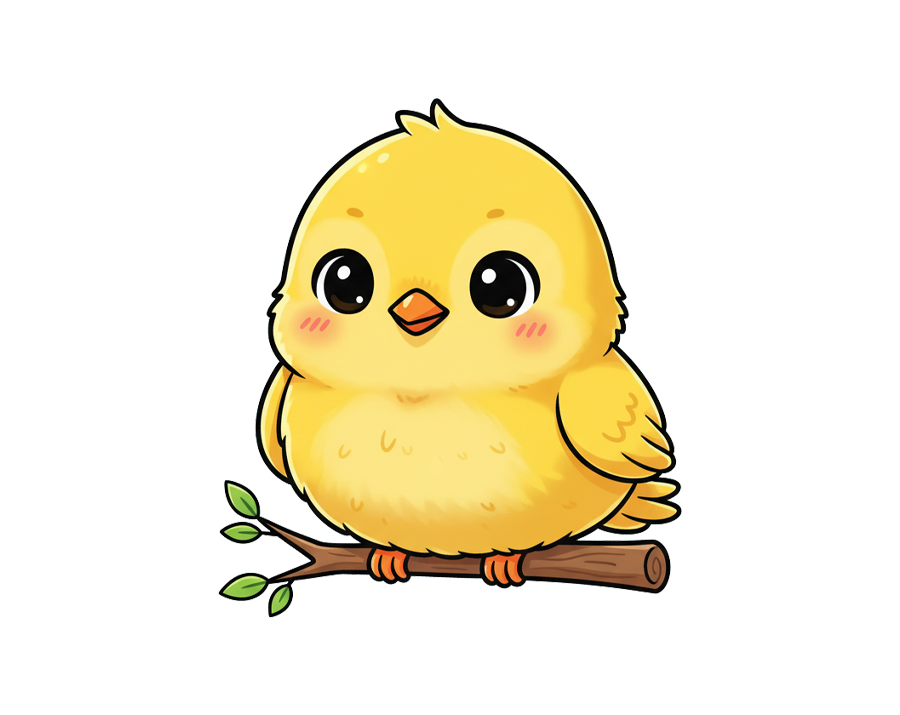An adorable, cartoon-style yellow chick illustration sitting on a branch, with large black eyes and a small orange beak