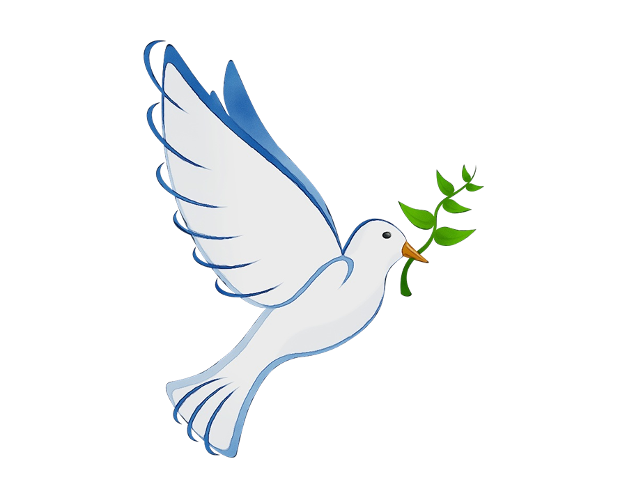 A stylized illustration of a white dove in flight with slightly spread wings, carrying a green olive branch in its beak.
