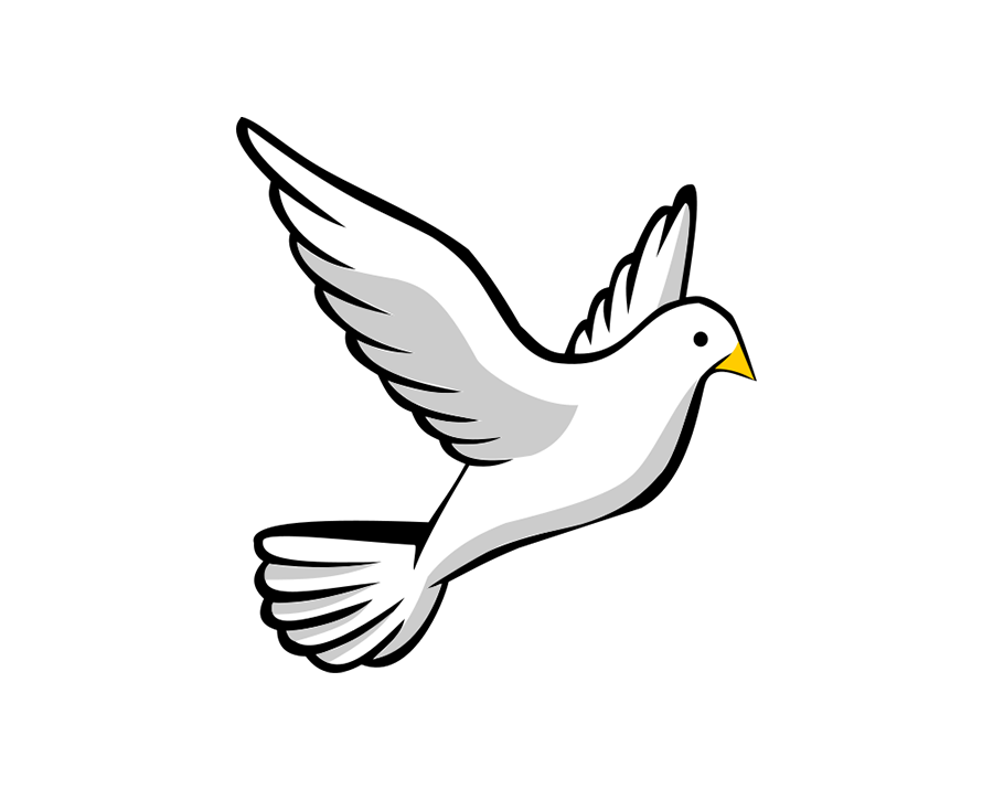 An illustration of a cartoon-style white dove in flight with outstretched wings and a yellow beak.