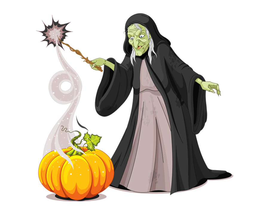 Elderly witch with a long pointed nose and green skin casting a spell with a wand over a pumpkin emitting magical smoke.