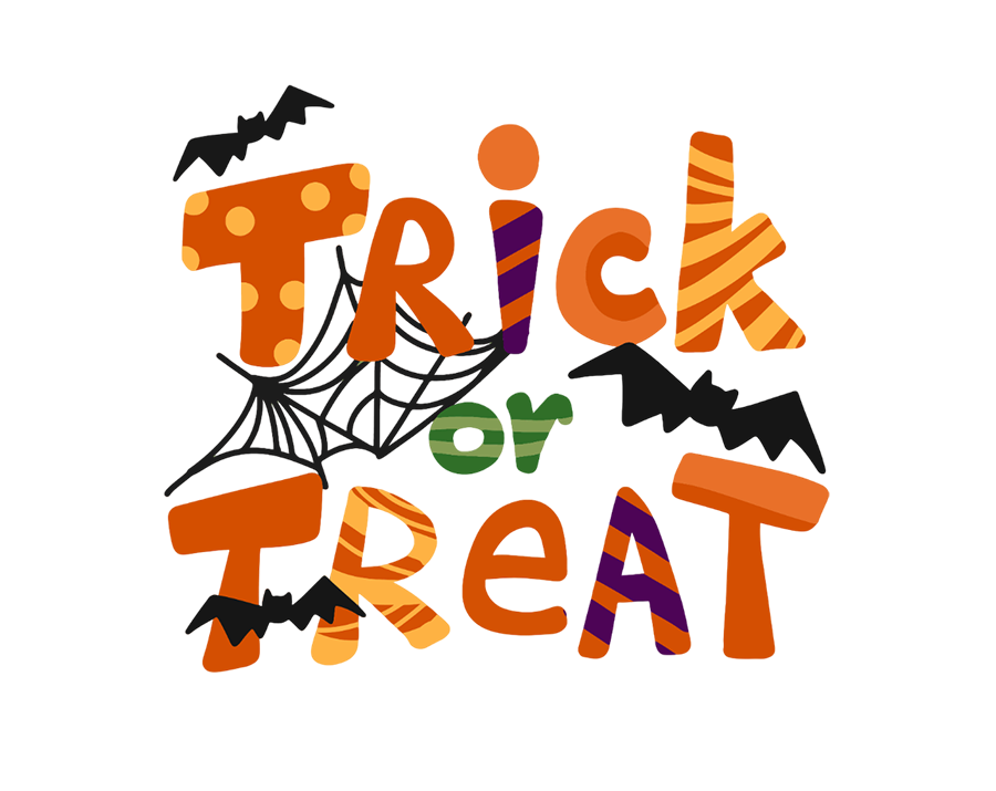 "Trick or Treat" spelled out in patterned, block letters using orange, yellow, and purple colors. The graphic features a spider web and bats. Transparent background Halloween clip art.
