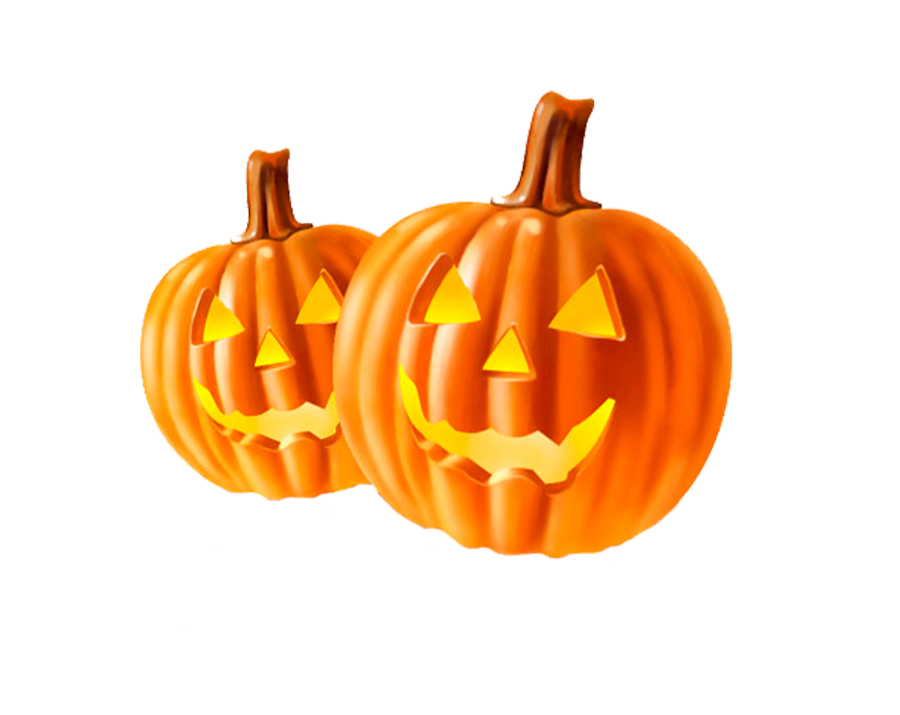 Two Jack-o'-lanterns (carved pumpkin lanterns) with spooky, grinning faces, glowing with bright orange light from within, on a transparent background.