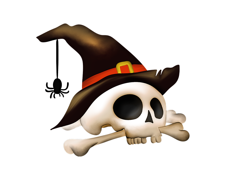 A digital illustration of a spooky skull wearing a dark, wide-brimmed witch's hat and holding a white bone in its mouth, set against a transparent background.