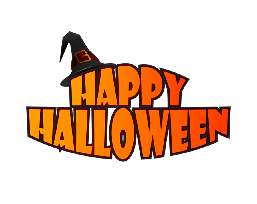 Orange "Happy Halloween" text graphic with a black witch hat on top. Transparent PNG.