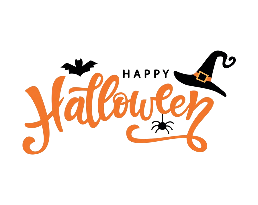 Transparent PNG image with "Happy Halloween" in orange script lettering, accompanied by black silhouettes of a witch hat, a bat, and a spider.