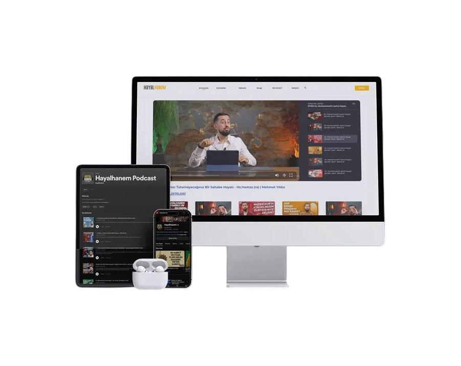 A digital device mockup showing Hayalhanem content across a desktop monitor, a tablet (Hayalhanem Podcast), a smartphone, and a pair of white wireless earbuds.