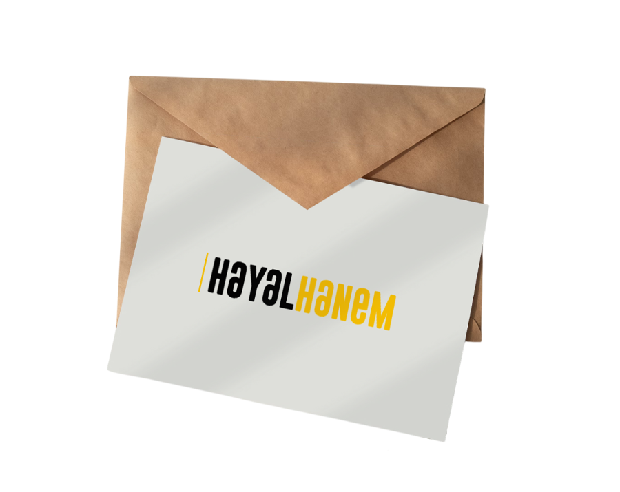 A transparent PNG image of a brown envelope with a white card inside showing the Hayalhanem logo in black and yellow text.