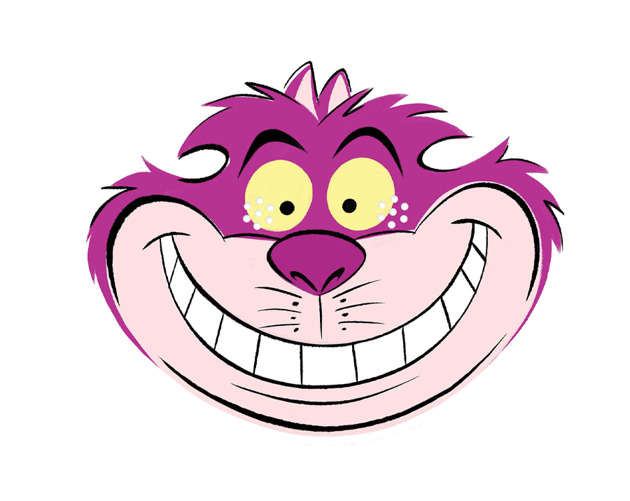 An illustration of the Cheshire Cat's head from Alice in Wonderland, featuring its wide grin, bright yellow eyes, and purple-pink fur.