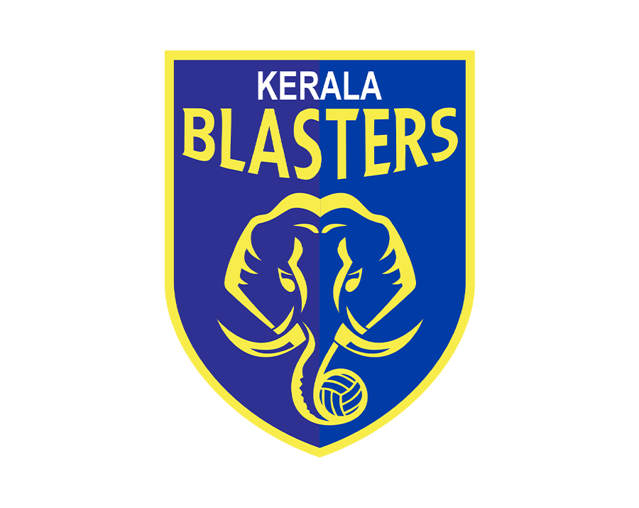 The Kerala Blasters FC logo, a shield in navy blue featuring a stylized yellow elephant's head with large tusks and a raised trunk, standing on a football at the center, with KERALA BLAZERS written above.