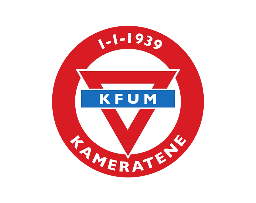 KFUM-Kameratene Oslo Football Club Logo, Featuring White "KFUM" Text within a Blue Rectangle, Inside a Downward-Pointing Red Triangle, Enclosed by a Red Outer Ring with Establishment Date "1-1-1939" and "KAMERATENE" Text.