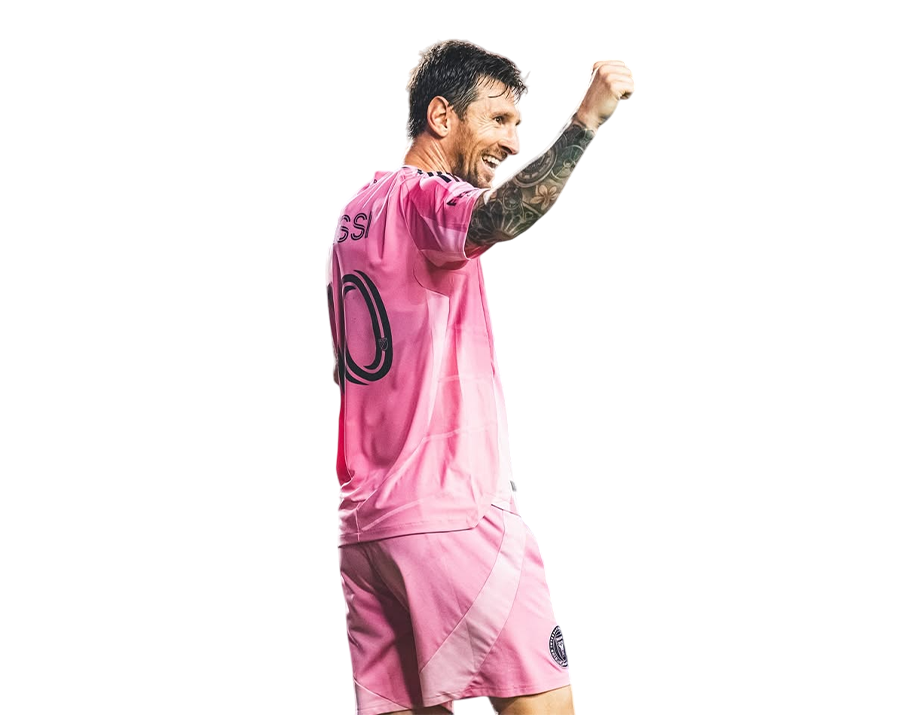 Lionel Messi in a pink soccer jersey with number 10 celebrating a goal