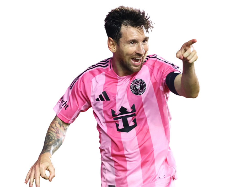 Lionel Messi in a pink striped Inter Miami kit, celebrating a goal and pointing with his right hand. Transparent PNG.