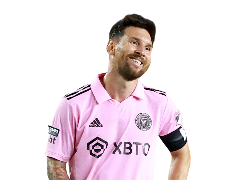 Lionel Messi smiling brightly in his pink Inter Miami CF home jersey. Transparent PNG.