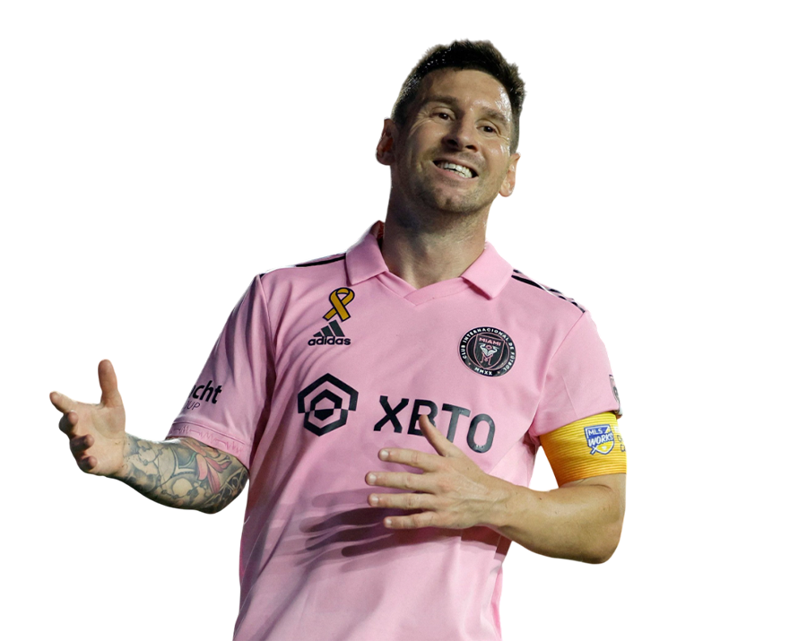 Lionel Messi smiling and gesturing with his hands in the pink Inter Miami CF kit. Transparent PNG.