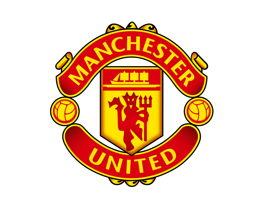 The Manchester United FC logo, featuring a red shield with a Red Devil holding a trident, centered within a red and yellow banner that reads MANCHESTER above and UNITED below.