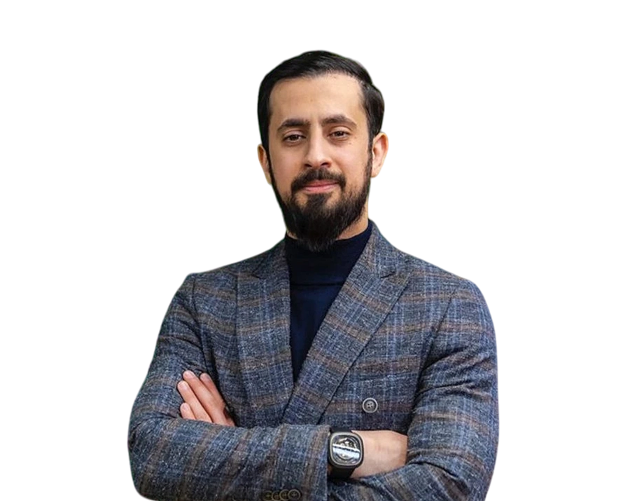Portrait of Mehmet Yıldız with a short beard, wearing a plaid blazer over a dark turtleneck and a wristwatch, standing with his arms crossed on a transparent background.