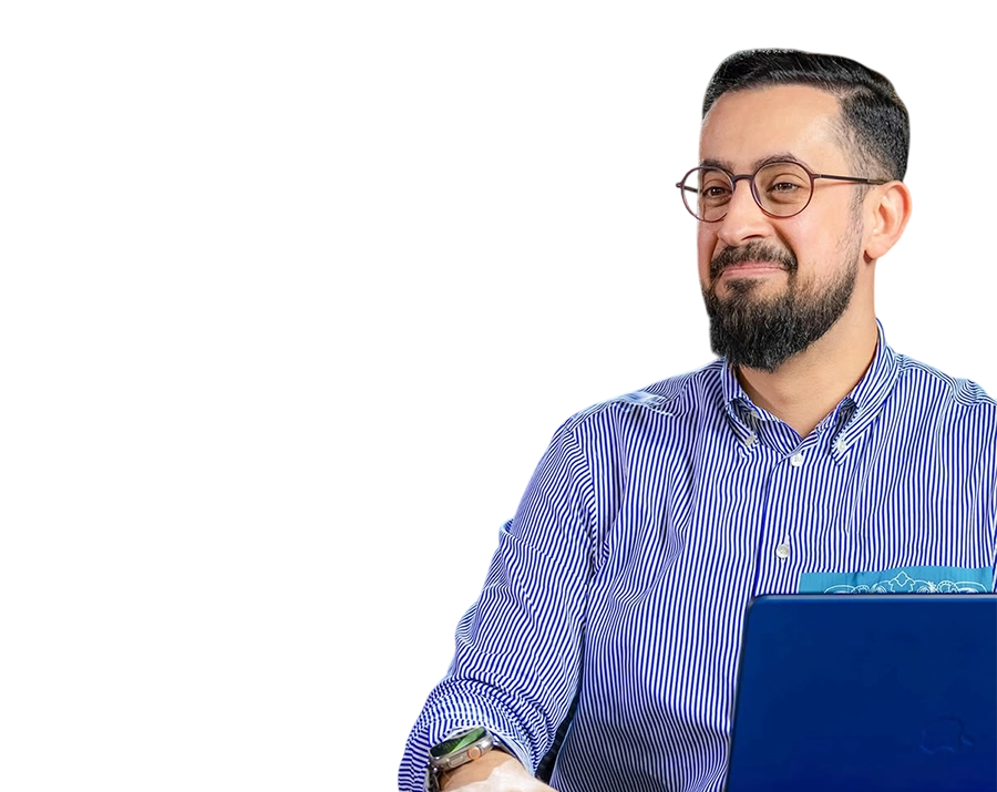 Mehmet Yıldız, a Turkish author and speaker, smiling while working on a laptop. Transparent background.