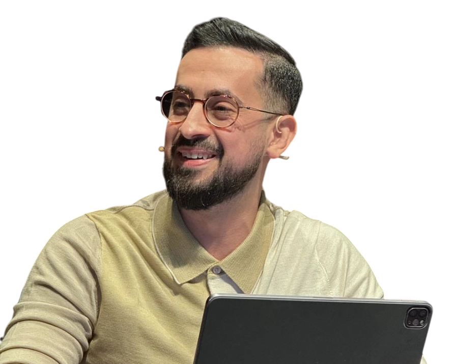Headshot of Mehmet Yıldız, smiling and wearing glasses and a two-toned light beige polo shirt, working with a tablet in the foreground, on a transparent background.