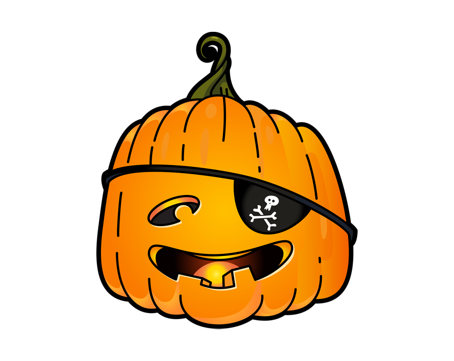 Carved pumpkin (Jack-o'-lantern) illustration winking and grinning, wearing a pirate eye patch with a skull and crossbones emblem.