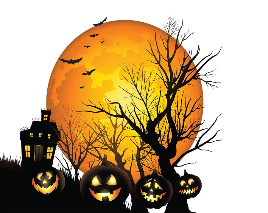 Silhouette of glowing Halloween Jack-o'-Lanterns, a haunted house, dead trees, and bats against a giant orange full moon.