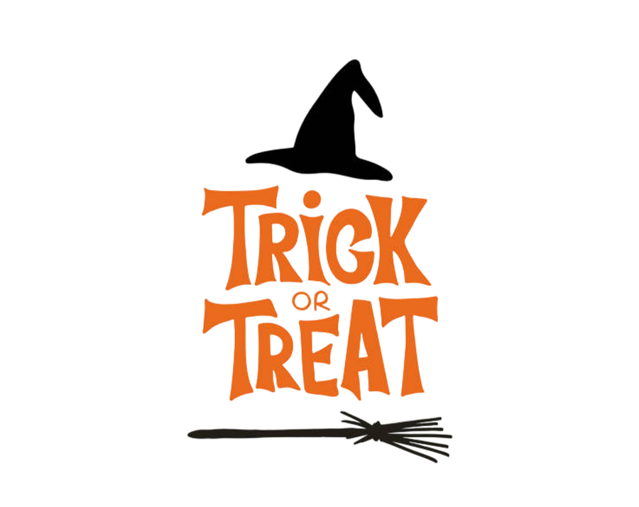 "Trick or Treat" in bold, slightly gothic-style orange lettering. Features a black witch hat on top and a black broomstick at the bottom. Transparent background Halloween graphic.