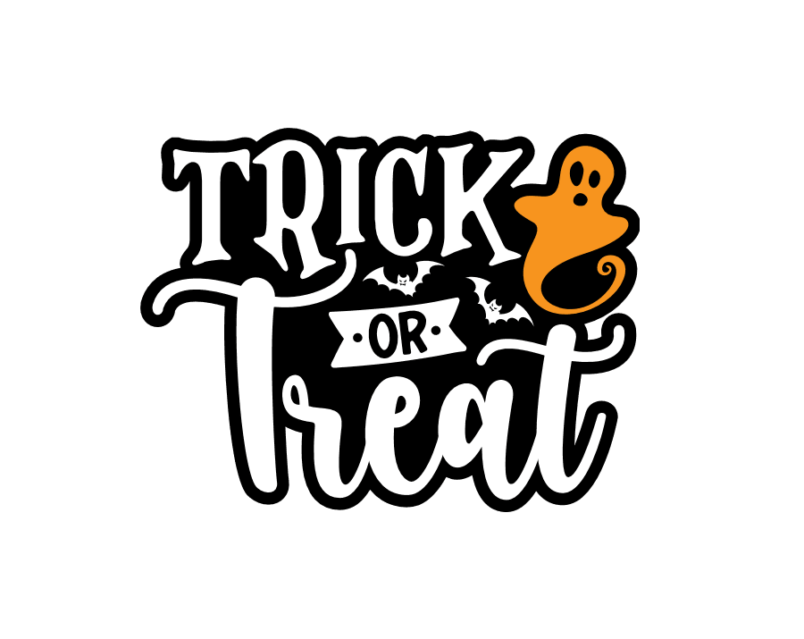 Transparent Halloween PNG image of "TRICK OR TREAT" lettering in black and white script with an orange ghost and bat silhouettes.