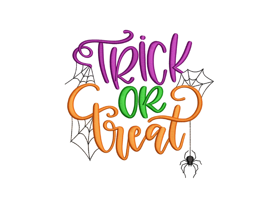 Transparent Halloween PNG image of "TRICK OR TREAT" embroidery-style lettering in purple, green, and orange, with a spiderweb and a spider.