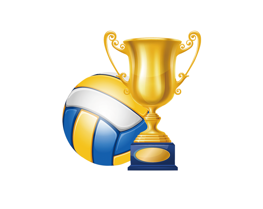 A shiny gold winner's trophy next to a blue, yellow, and white volleyball.